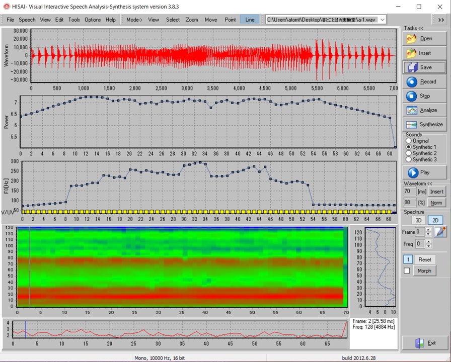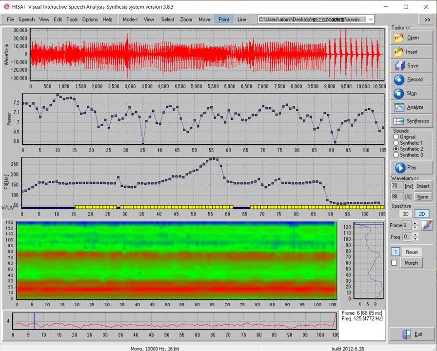 だが、曲線を音の高さの変化とみなせば、音にできる。つまり楽譜とみなすのだ。琉球大に在職中研究室で開発した、音声合成スペクトル・エディタ(HISAIシステム)[1]を使えば、即座にできる。