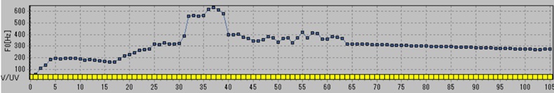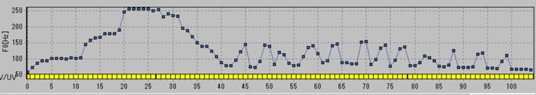 首里城には阿形、吽形の大龍柱が立っています。それを上向きにし、横顔の輪郭線を音の高さの時間変化と見立て、それにより声を作りました。阿形の音色は「アー」、吽形の音色は「ウー」としました。上から横顔、基本周波数の時間変化、音声です。